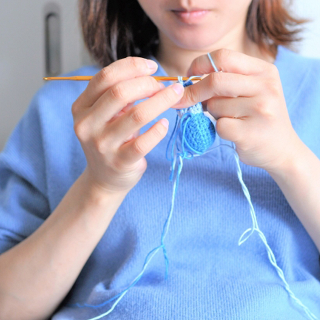 ニット。かぎ針編み、ネックから編むトップダウンのとじはぎなしのセーターや、一筆編みミトンにはまっています。